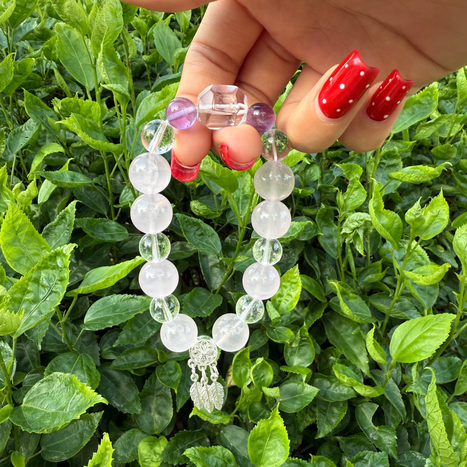 • Clear Quartz: A master amplifier and purifier, it brings mental clarity, enhances focus, and magnifies the energy of Rose Quartz and Amethyst.